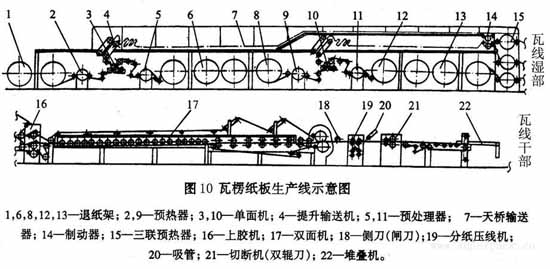 七層瓦楞紙板生產(chǎn)線(xiàn) 溫度與壓力在瓦楞紙板生產(chǎn)過(guò)程中所起的作用是至關(guān)重要的。在烘道復(fù)合紙板的過(guò)程中,更是特別重要。我們現(xiàn)在所用的黏合劑是淀粉生膠,而生膠在作用于兩個(gè)物體問(wèn)是沒(méi)有粘合作用的。如何使生膠反應(yīng)成熟膠,就必須要由溫度來(lái)幫助。有人曾做過(guò)一個(gè)實(shí)驗(yàn):用一個(gè)容器盛放生膠,另一個(gè)容器里盛水放在爐子上加溫,將盛有生膠的容器放在另一個(gè)容器里,并用一根溫度計(jì)在盛有生膠的容器中攪拌,當(dāng)溫度上升到63℃時(shí),生膠就糊化了。這個(gè)實(shí)驗(yàn)說(shuō)明,要使生膠轉(zhuǎn)變成熟膠,必須要達(dá)到一定的溫度,否則就不可能使生膠徹底糊化,而沒(méi)有徹底糊化的粘合劑就不可能有理想的粘合效果。通常所用的生膠是作用于兩種紙的中間,要通過(guò)一層或多層紙才能將熱板的溫度傳遞到黏合點(diǎn),所以要求熱板的表面溫度在生產(chǎn)速度為80米/分鐘以下時(shí),必須要達(dá)到170℃(速度越快溫度越高)。若熱板的表面溫度沒(méi)有在紙板的粘合點(diǎn)使生膠瞬間糊化,水分就會(huì)被紙迅速吸收,這樣就會(huì)造成紙板的粘合強(qiáng)度降低。