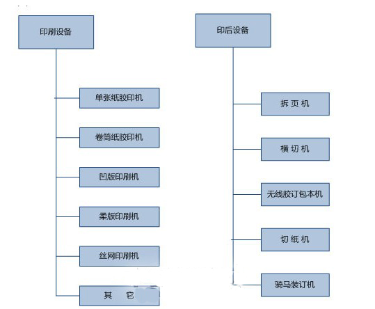 印刷行業(yè)的設(shè)備主要分為印刷設(shè)備和印后設(shè)備。印刷設(shè)備主要包含五類:單張紙膠印機(jī)、卷筒紙膠印機(jī)、凹版印刷機(jī)、柔版印刷機(jī)平、絲網(wǎng)印刷機(jī)。其中以凹版印刷機(jī)和絲網(wǎng)印刷機(jī)為目前的主流設(shè)備。